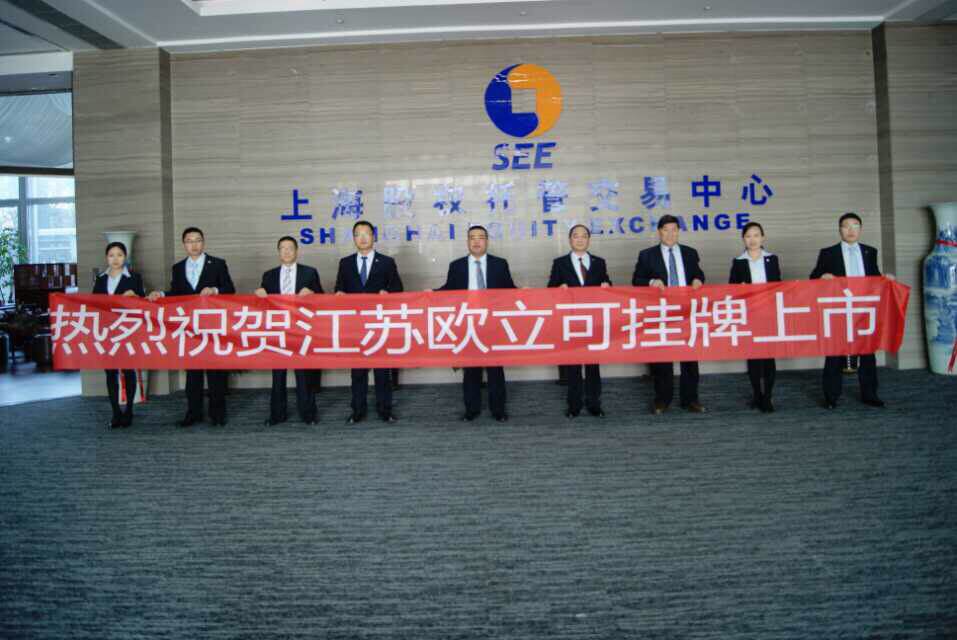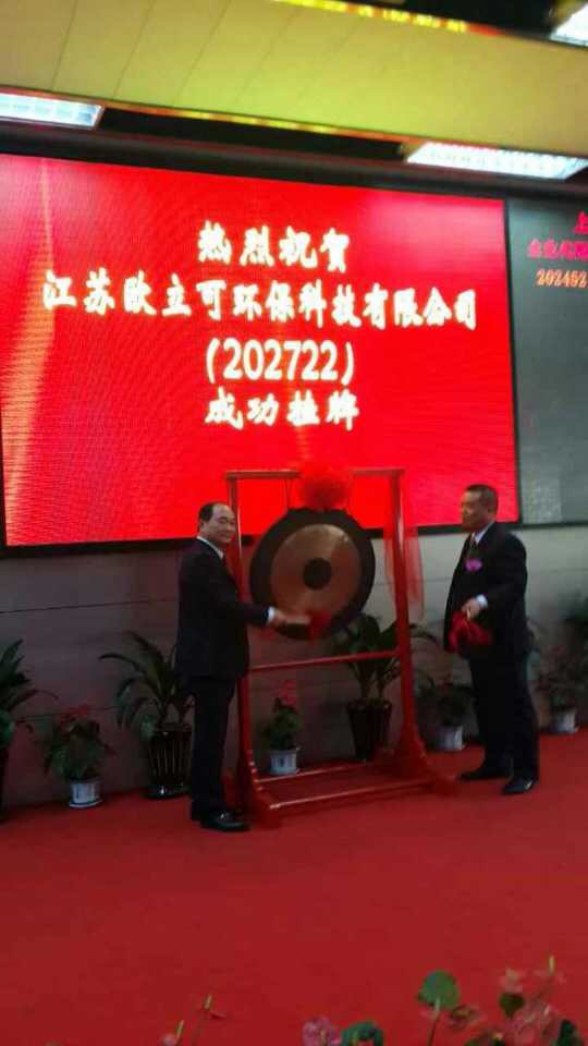 2014年12月5日中午11點18分,鳴鑼掛牌儀式在上海股權交易中心隆重舉行,江蘇歐立可環保科技有限公司董事長豐偉、總經理李繼強等高管出席掛牌儀式。江蘇歐立可環保科技有限公司董事長豐偉上臺致辭,他介紹道:歐立可自成立以來一直專注節能減排、綠色環保的產品研發及生產,針對水處理與節省燃氣等系統性解決方案,堅持創新、高效、團結、誠信,通過持續的技術創新和不斷突破,取得了今天輝煌的成就。